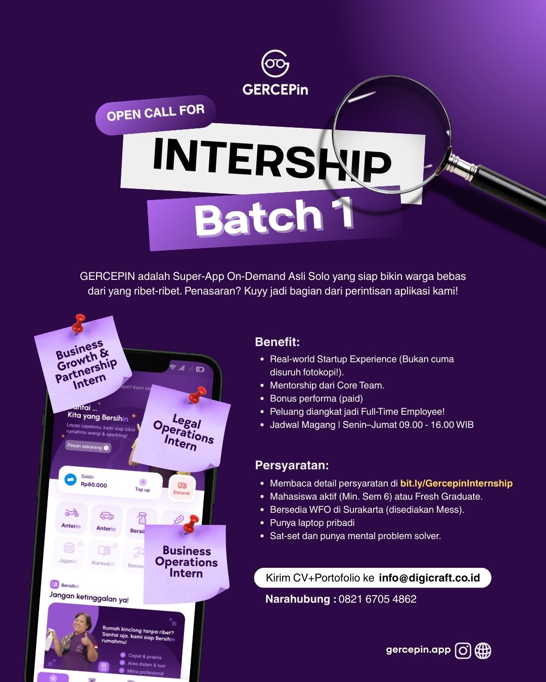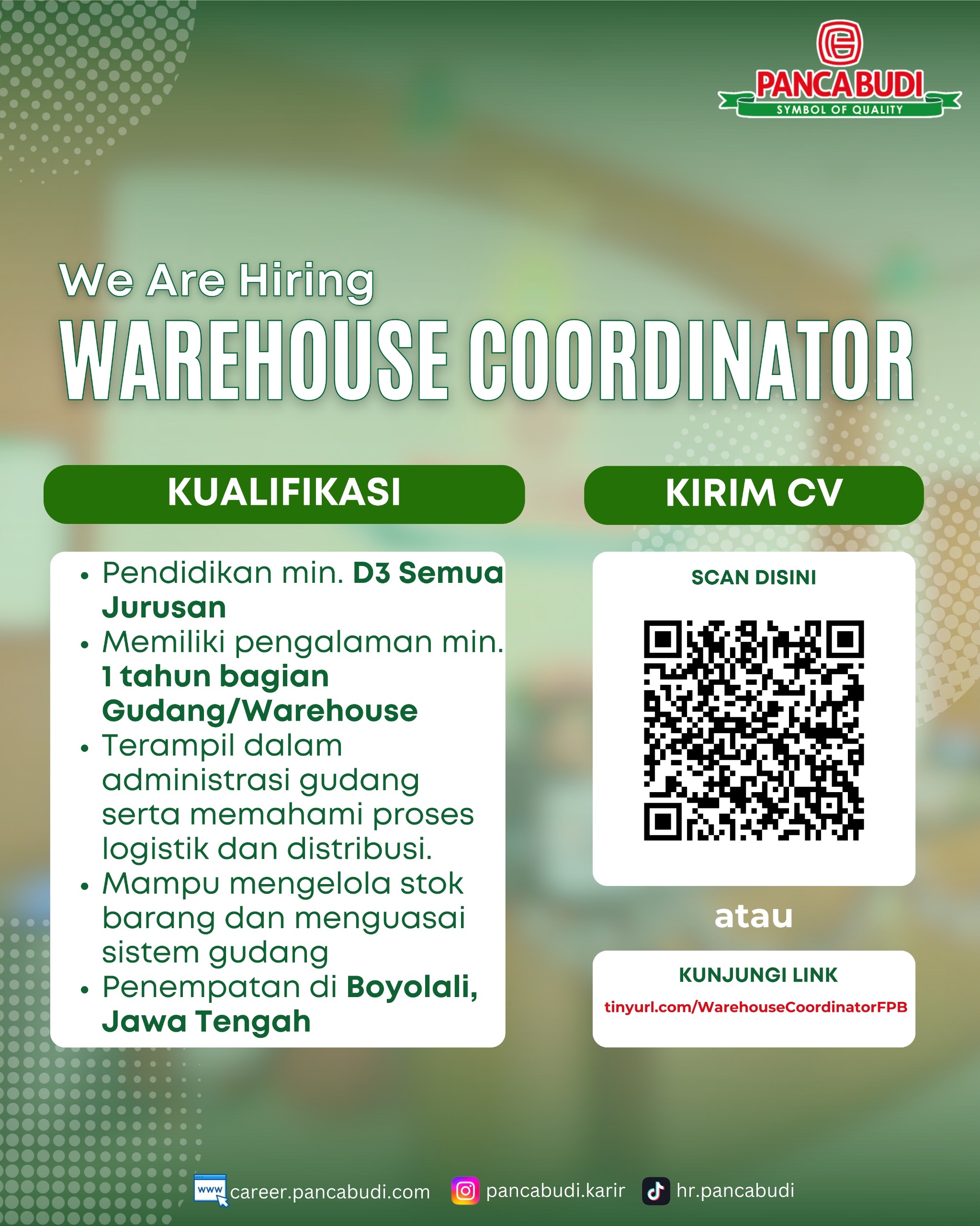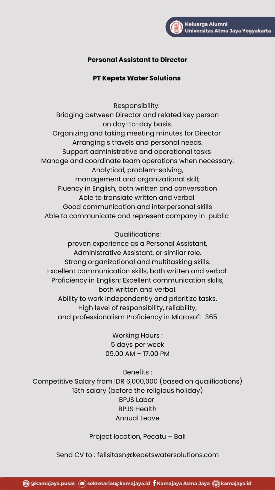 Untuk tahap awal, laman ini akan diisi dengan lowongan-lowongan kerja yang masuk ke Sekretariat KAMAJAYA. Selanjutnya kami akan menyelenggarakan program-program pembinaan dan pengembangan profesionalitas dan kompetensi untuk membantu para lulusan baru Universitas Atma Jaya Yogyakarta dalam memulai karir profesional mereka.
