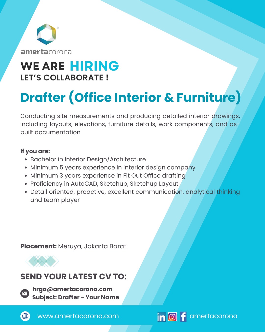 TANGGAL POSTING 7 October 2025 DEADLINE - NAMA PERUSAHAAN amertacorona POSISI Drafter (Office Interior & Furniture) KONTAK hrga@amertacorona.com